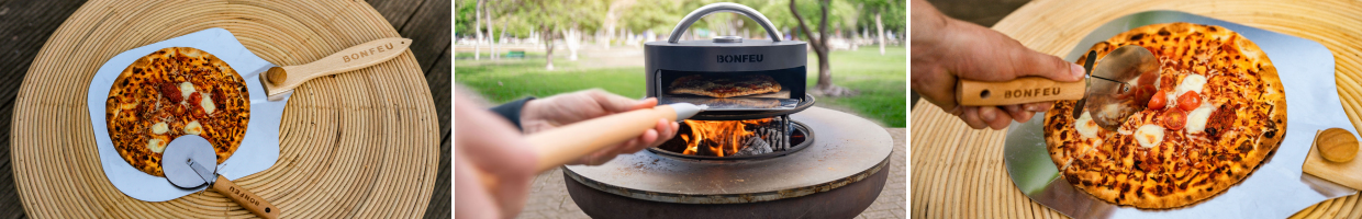Natürlich kannst du Pizza auch auf dem Grill backen. Die Feuerschalen von BonFeu und MOODZ lassen sich zum Beispiel mit dem BonFeu Pizzaofen erweitern. Dieser verfügt über einen stabilen Stahlgriff, mit dem sich die Klappe leicht öffnen und schließen lässt. Mit einem Durchmesser von 42 cm gelingen darin nicht nur köstliche Pizzen, sondern auch aromatische Focaccia oder ein frischer Apfelkuchen. Der Pizzaofen kann ausschließlich in Kombination mit einer Plancha und dem passenden Gestell genutzt werden. Auch auf dem BonFeu BonBiza und dem BonBiza Island kannst du diese Accessoires inklusive Pizzaofen verwenden.