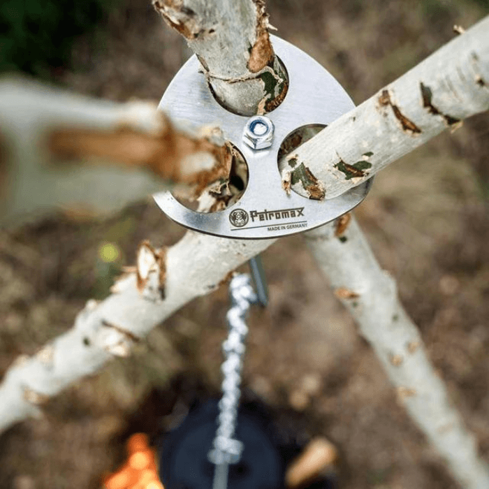 Bauen Sie Ihr eigenes Dreibein mit diesem großen Dreibeinring. Mit Löchern von 5,5 cm Durchmesser können Sie kräftige Äste verwenden, um ein hohes und stabiles Dreibein zu bauen. Der Ring wird standardmäßig mit einem Haken und einer Kette geliefert, um eine Pfanne, einen Grillrost oder eine Grillplatte aufzuhängen. Durch sein geringes Gewicht und seine geringe Größe (ø14,75 cm) lässt sich der Ring leicht verstauen und transportieren.